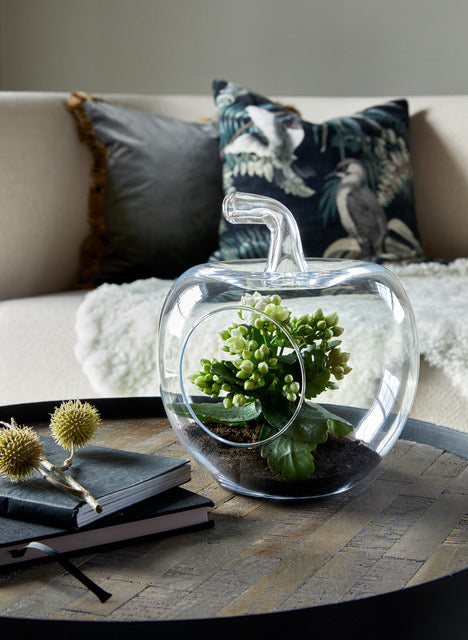 Dekoratiivne klaasist õun, mida saab kaunistada väikeste taimedega, nagu sukulendid ja kaktused, või lilledega. Klaasist õun on kaunis ka dekoratiivse liiva ja teeküünlaga. Asetage see koos teiste toodetega dekoratiivsele alusele.