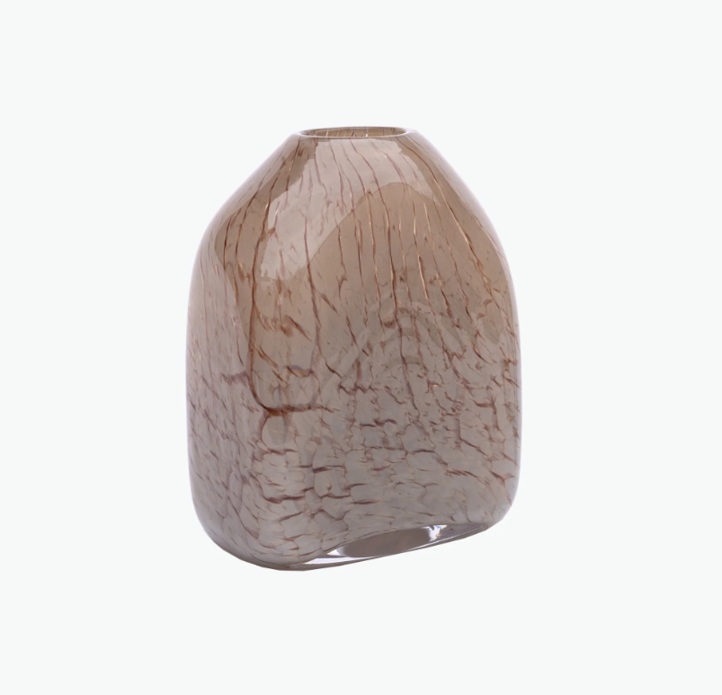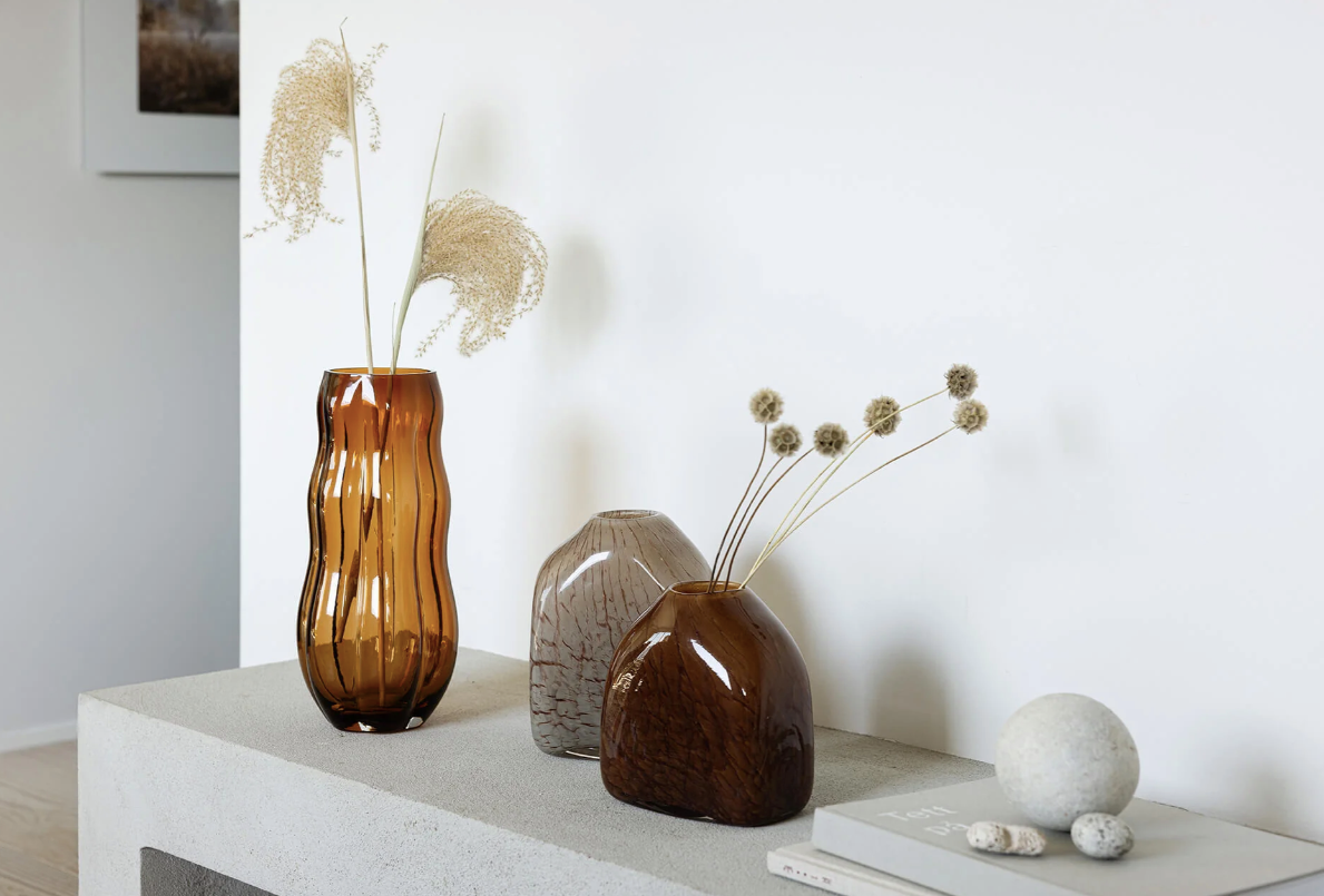 Denna något asymmetriska vas kombinerar modern design med jordnära färger. Den fungerar lika bra som dekoration eller med blommor eller kvistar. Passar perfekt bredvid Aubrey- och Umi-vaserna med samma färgtoner.