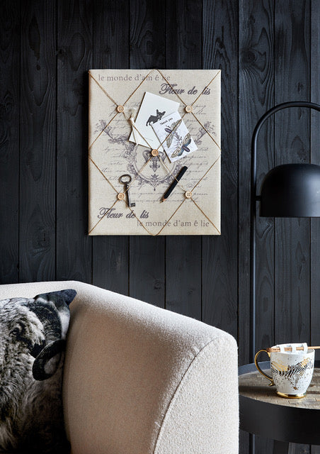 Stiilne ja dekoratiivne teadetetahvel, kuhu saate juteniitide taha kinnitada meeldetuletusi, pilte või postkaarte. Sobib hästi esikusse, kontorisse, lastetuppa või kööki. Tagaküljel 2 siksak-kinnitust.
