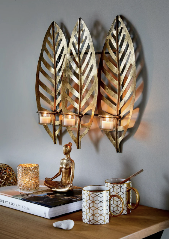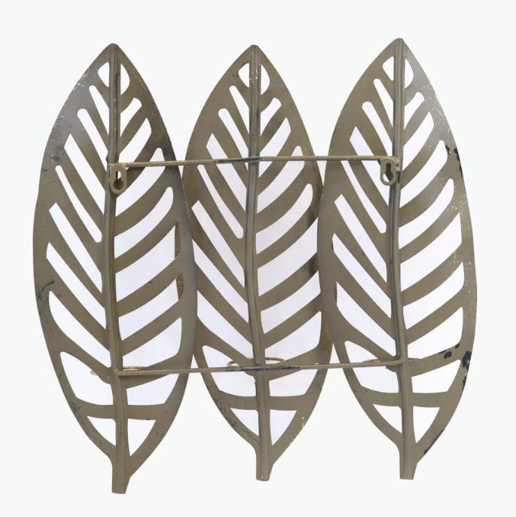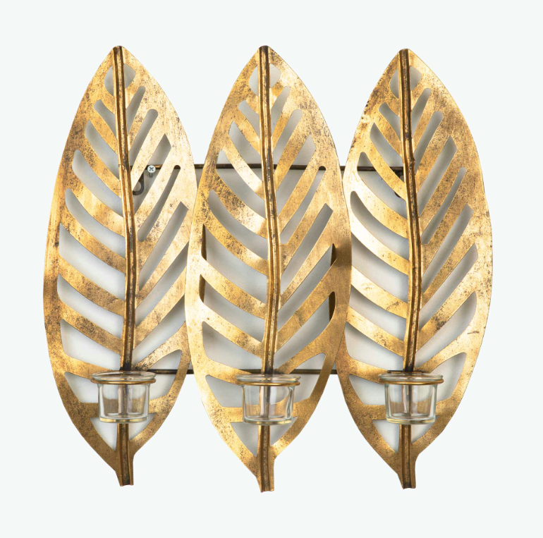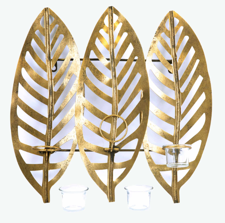 Dekoratiivne seinaküünlajalg kauni lehekujundusega, mis sobib ideaalselt seinale riputamiseks. Havana on käsitsi valmistatud rauast ja viimistletud antiikse kuldse tooniga. Teeküünlaalused on klaasist.