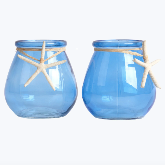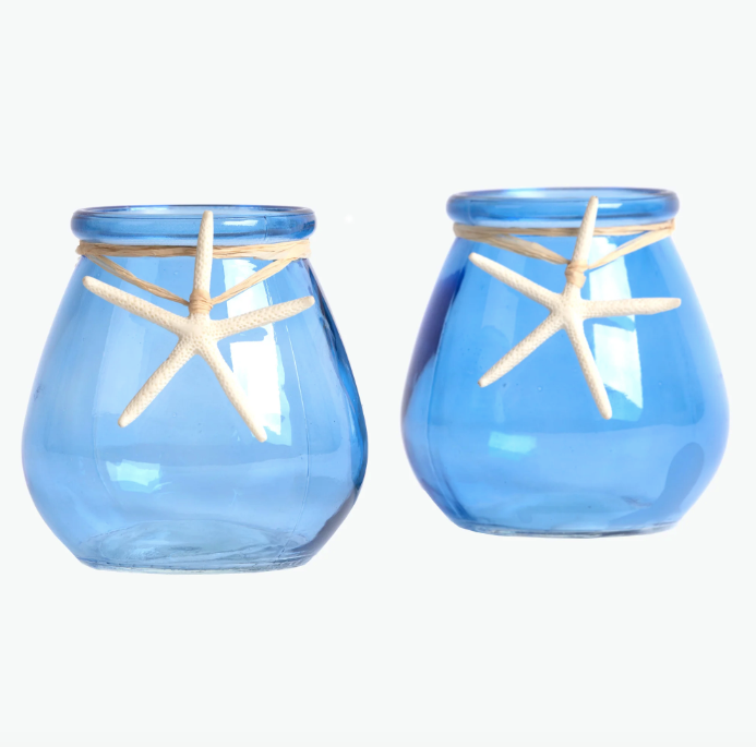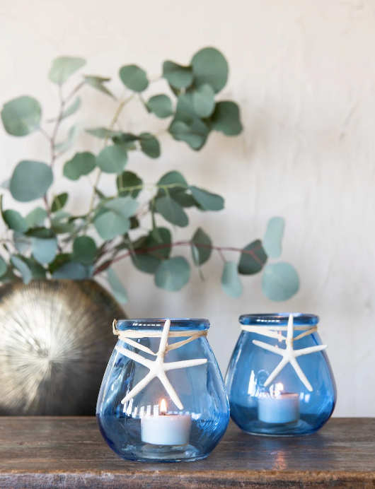 Somriga och stämningsfulla värmeljushållare av återvunnet blått glas med en dekorstjärna som är fäst med strå.