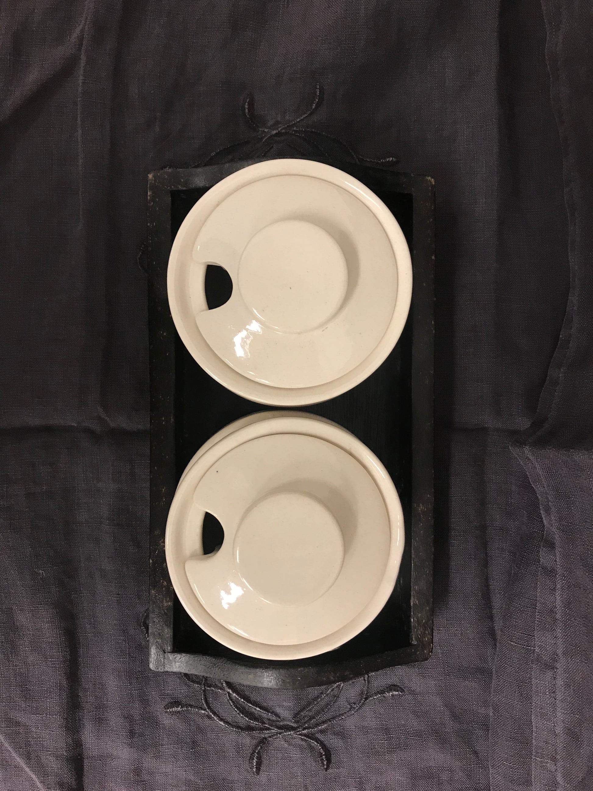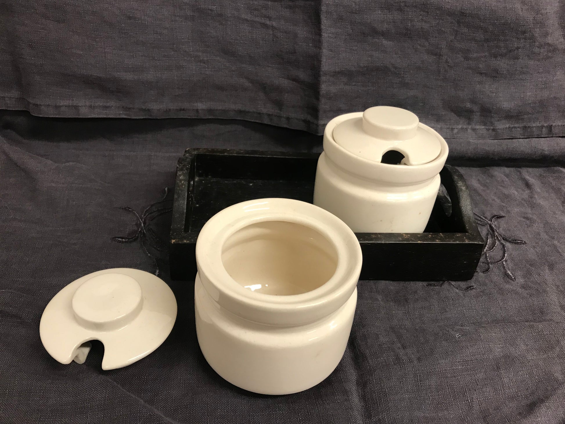 Kaks ilusat moosipurki, mis seisavad puidust alusel. Kena detail köögis.